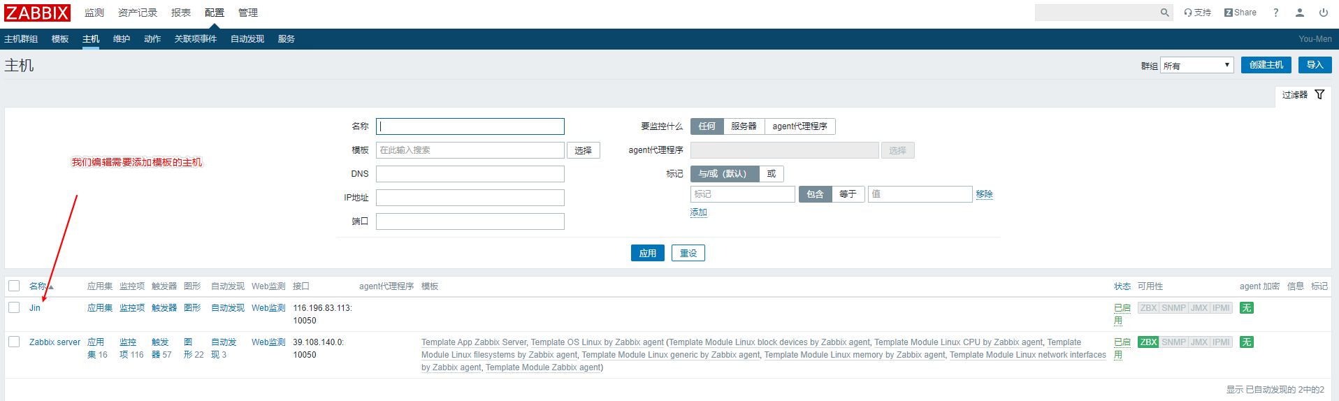 如果等上一段時(shí)間,可用性哪里沒(méi)有紅色警告,就說(shuō)明這臺(tái)主機(jī)被添加進(jìn)來(lái)了,但是因?yàn)闆](méi)有掛載模板和創(chuàng)建監(jiān)控項(xiàng),所以我們接下來(lái)嘗試著掛載一下模板,然后再去創(chuàng)建監(jiān)控項(xiàng).