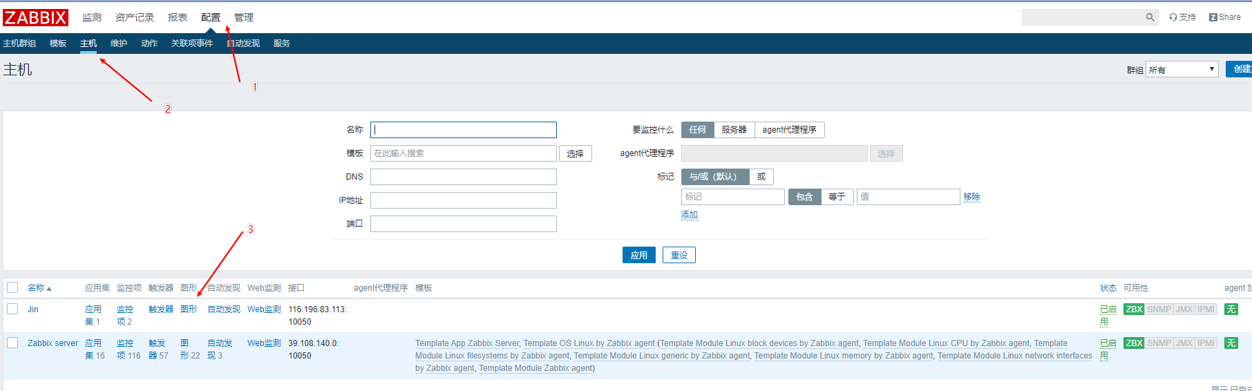 接下來(lái)我們到web界面上配置如何監(jiān)控本地主機(jī),我們看到接口上是127.0.0.1,但是我們配置文件寫(xiě)的是39.108.140.0,我們讓這兩個(gè)IP一致.點(diǎn)擊3進(jìn)去然后修改.