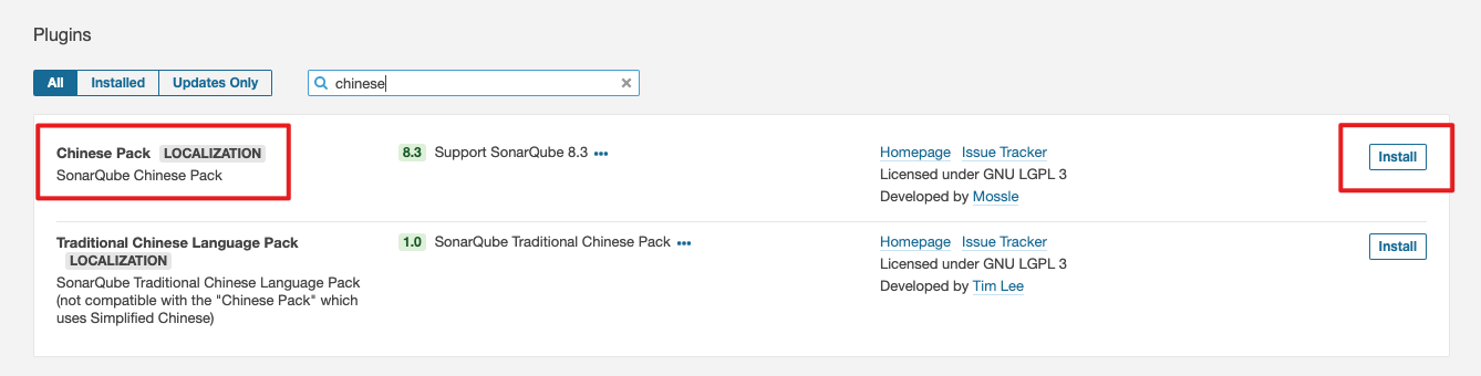 SonarQube提供了強(qiáng)大的插件管理功能,以中文語(yǔ)言包為示例,講解如何安裝插件: