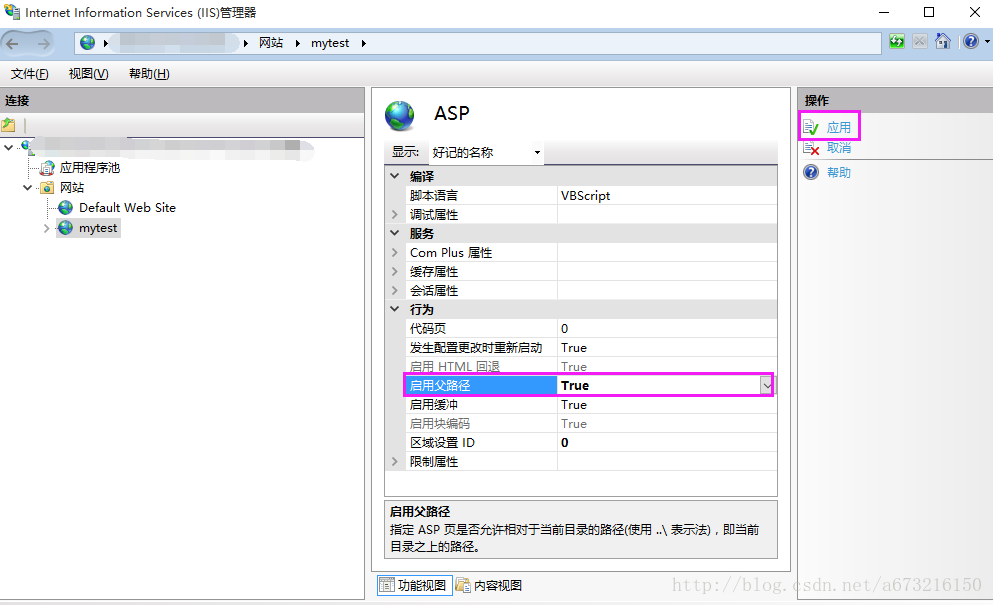 9、IIS中默認(rèn)未啟用父路徑,啟用父路徑才可以在ASP程序中使用相對(duì)路徑。選中“mytest主頁”下方的“ASP”,右擊“打開功能”,將“啟用父路徑”設(shè)置為True,點(diǎn)擊右側(cè)的“應(yīng)用”即可。