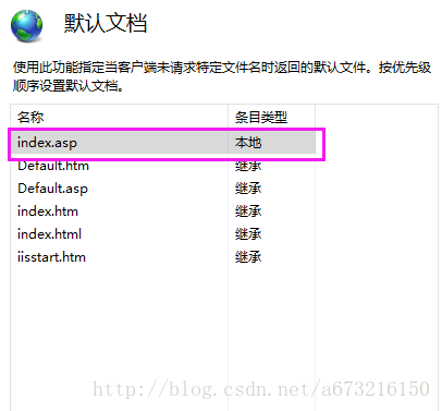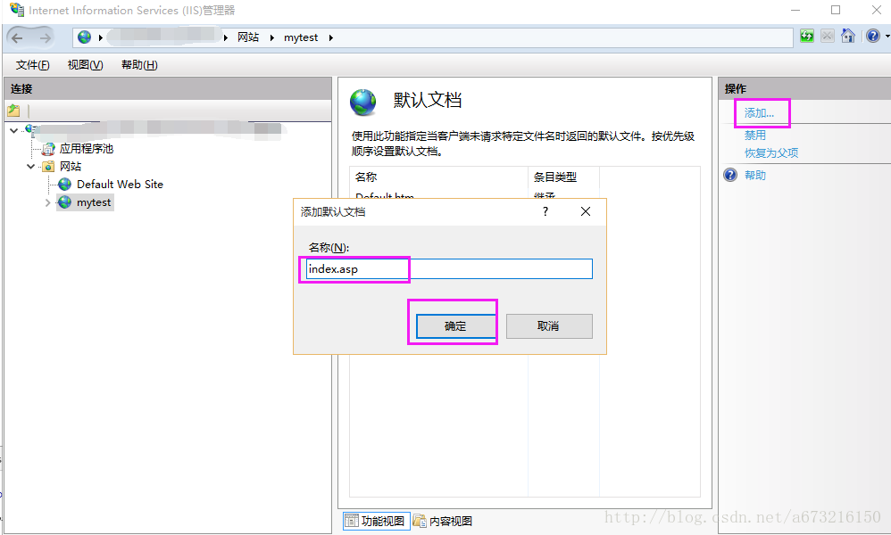 8、將index.asp作為默認(rèn)文檔。選中“mytest主頁”下方的“默認(rèn)文檔”,右擊“打開功能”,添加默認(rèn)文檔。