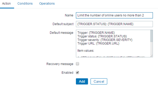 在Action選項(xiàng)中,定義Name:Limit the number of online users no more than 2