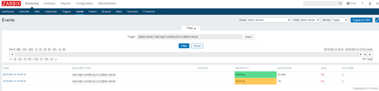 從" Number of logged in users" Item的歷史數(shù)據(jù)中也可看到trigger觸發(fā)時(shí),第3個(gè)登錄用戶(hù)即被下線(xiàn)。