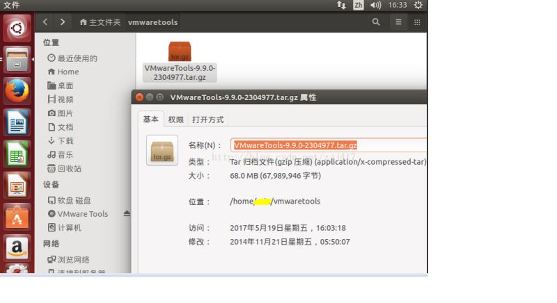 (2)如果沒(méi)有選擇直接提取到,就進(jìn)行解壓:tar xzf /(這里是你壓縮包復(fù)制到的位置,可以在壓縮包右鍵屬性中的位置查看)/VMwareTools-9.9.0-2304977.tar.gz(這是壓縮包的名稱(chēng));