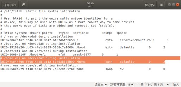 編輯fstab文件,下圖橙色的那兩行就是home目錄掛載的位置,將上一步查找到的uuid替換文件中的uuid。