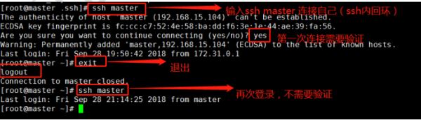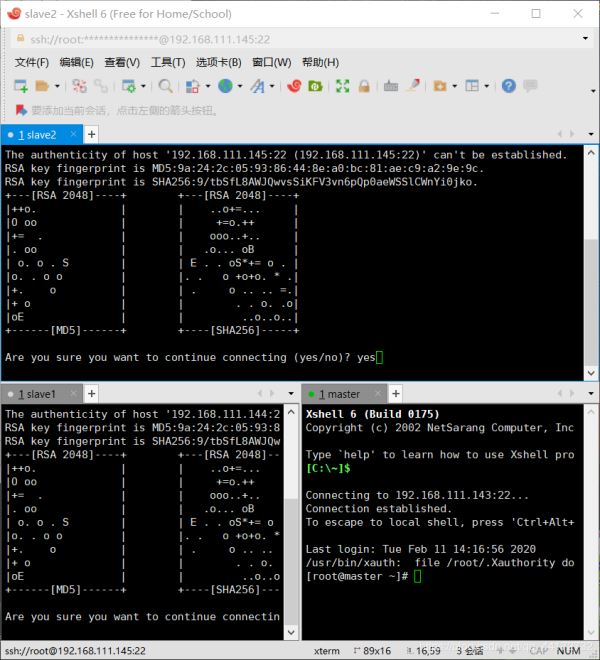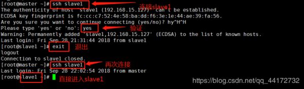 slave1 結(jié)點(diǎn)首次連接時需要,“yes”確認(rèn)連接,這意味著 master 結(jié)點(diǎn)連接 slave1 結(jié)點(diǎn)時需要人工詢問,無法自動連接,輸入 yes 后成功接入,緊接著注銷退出至 master 結(jié)點(diǎn)。