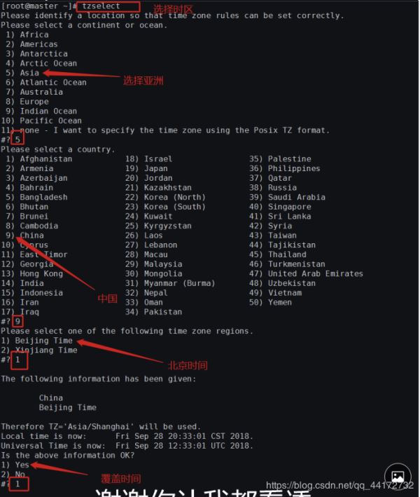 時間同步 時區(qū)一致。要保證設(shè)置主機(jī)時間準(zhǔn)確,每臺機(jī)器時區(qū)必須一致。實(shí)驗(yàn)中我們需要同步網(wǎng)絡(luò)時間,因此要首先選擇一樣的時區(qū)。先確保時區(qū)一樣,否則同步以后時間也是有時區(qū)差。可以使用 date 命令查看自己的機(jī)器時間. 選擇時區(qū):tzselect