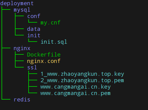 deployment目錄包含 mysql 容器配置信息, nginx 容器配置信息和 redis 容器數(shù)據(jù)目錄。