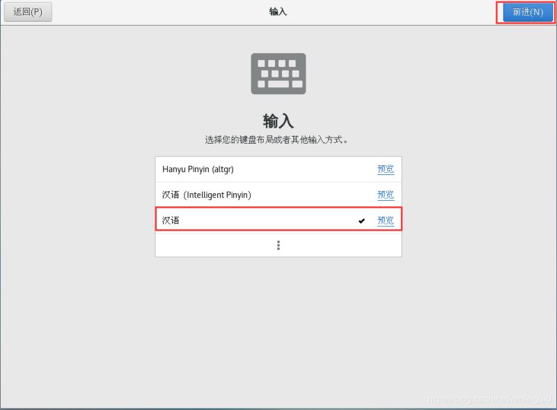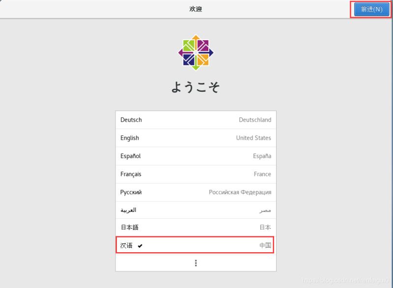 7、登錄成功后進(jìn)入圖形化桌面系統(tǒng),選擇漢語(yǔ),點(diǎn)擊前進(jìn)。