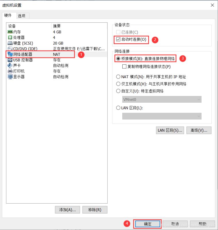 2、點(diǎn)擊網(wǎng)絡(luò)適配器,選中啟動(dòng)時(shí)連接,選擇橋接模式,點(diǎn)擊確定。