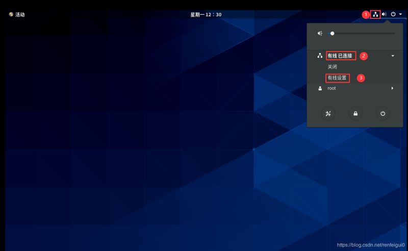7、啟動(dòng)虛擬機(jī),點(diǎn)擊右上角網(wǎng)絡(luò)圖標(biāo),點(diǎn)擊有線,點(diǎn)擊有線設(shè)置。