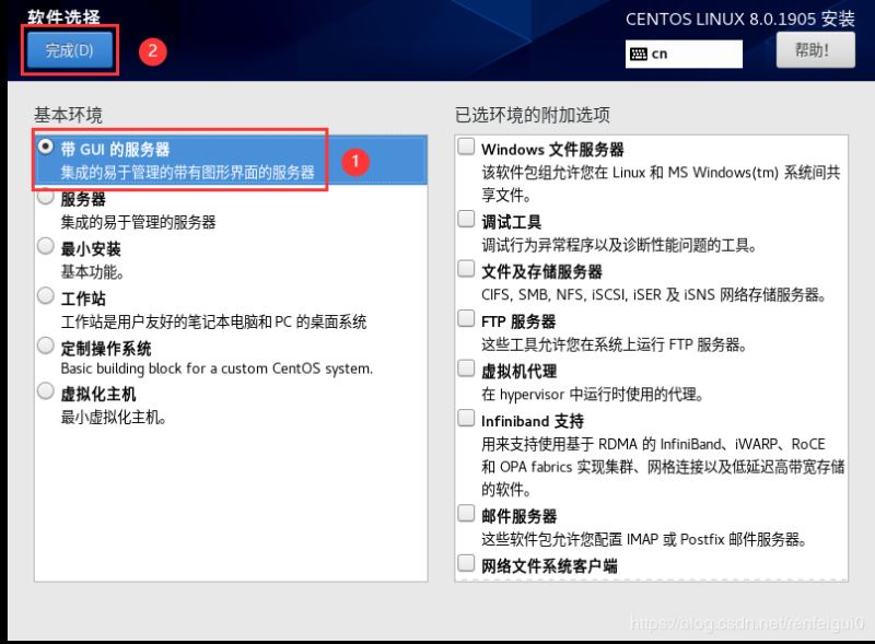 11、此處選擇帶GUI的服務(wù)器或工作站(安裝完成后進(jìn)入圖形化桌面系統(tǒng))然后點(diǎn)擊完成。(若選擇服務(wù)器或最小安裝或定制操作系統(tǒng)虛擬化主機(jī),安裝完成后進(jìn)入命令行系統(tǒng))。