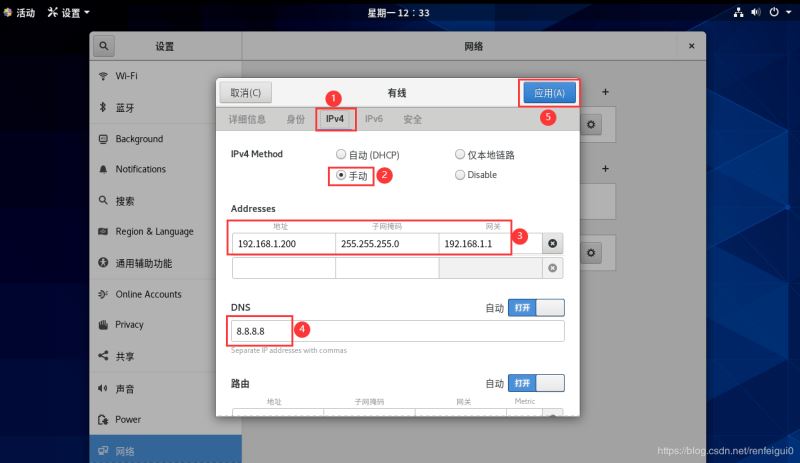 9、點(diǎn)擊IPv4選項(xiàng)卡,設(shè)置手動(dòng)取得IP地址,設(shè)置Addresses(虛擬機(jī)IP地址、子網(wǎng)掩碼、網(wǎng)關(guān)),設(shè)置DNS,最后點(diǎn)擊應(yīng)用。