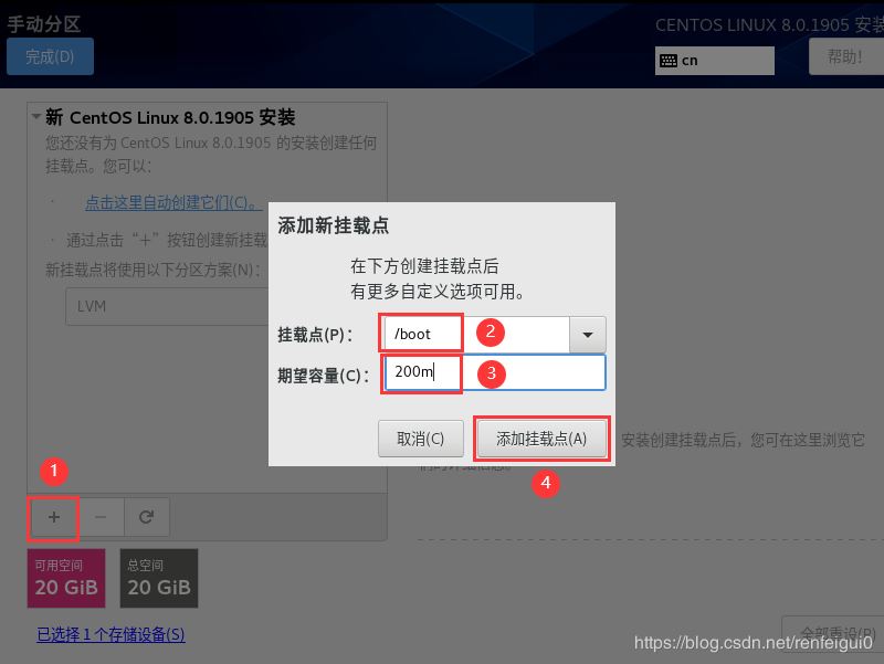 14、彈出下圖界面,點(diǎn)擊加號(hào),選擇/boot,給boot分區(qū)分200M,最后點(diǎn)擊添加掛載點(diǎn)。