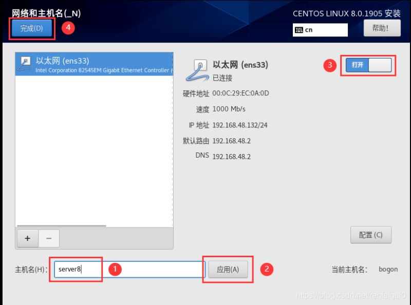 7、首先打開(kāi)網(wǎng)卡開(kāi)關(guān),然后查看是否能獲取到IP地址(虛擬機(jī)網(wǎng)絡(luò)適配器默認(rèn)使用NAT模式),更改主機(jī)名,點(diǎn)擊應(yīng)用,點(diǎn)擊完成。