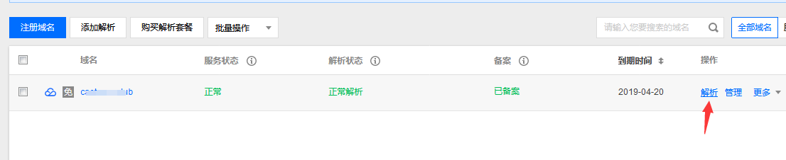接下來我們需要登錄所購域名運營商的域名管理后臺,點擊‘域名解析':