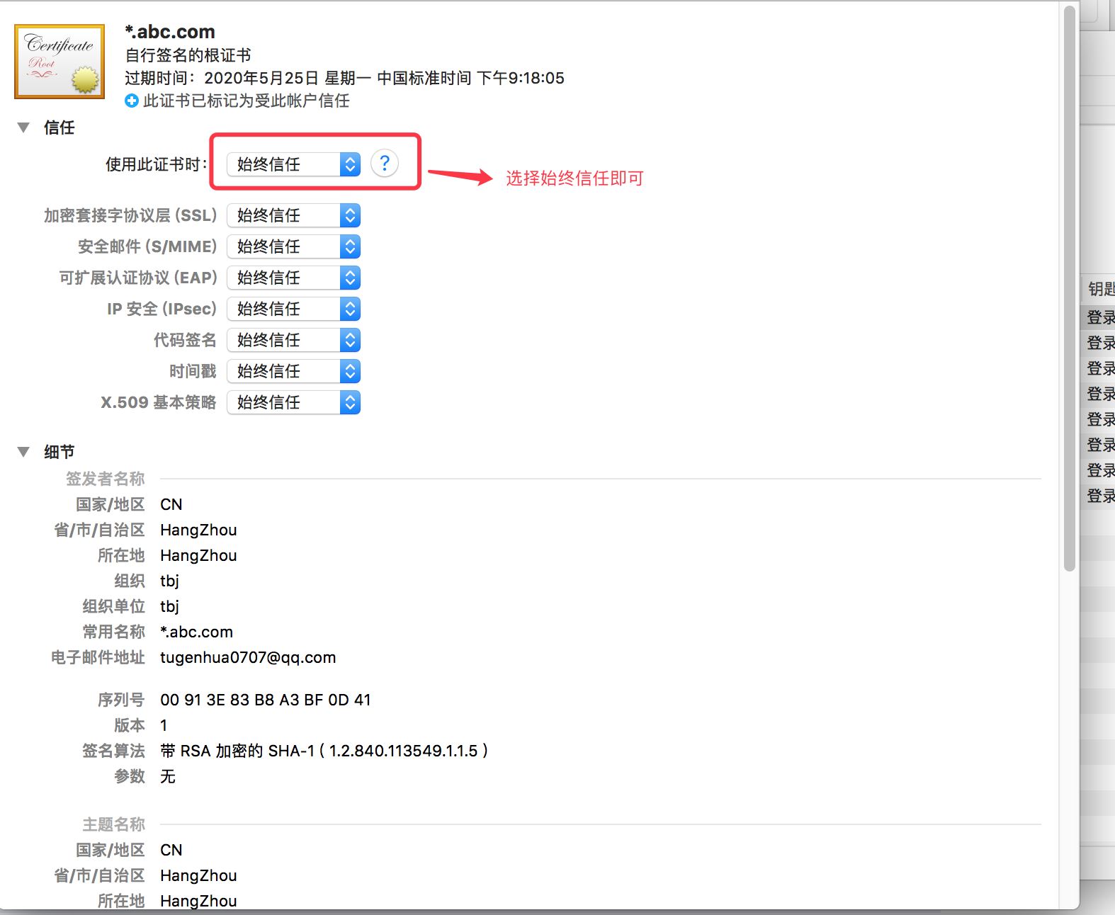 5. 進(jìn)入頁面后,使用證書時(shí),選擇始終信任后,如下圖所示: