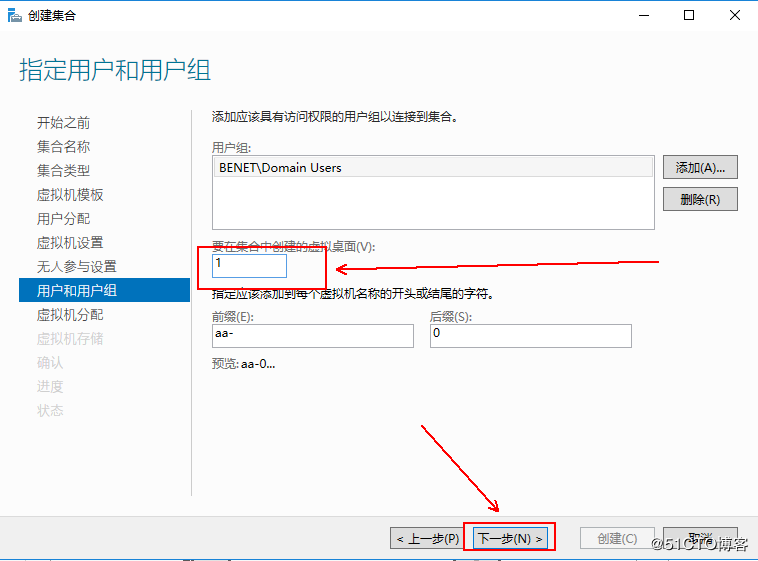 9、這里設置虛擬桌面發(fā)布的數(shù)量(數(shù)量和完成的速度相關,數(shù)量越多,部署越慢)和虛擬桌面前綴等信息,設置完成后,單擊“下一步”:
