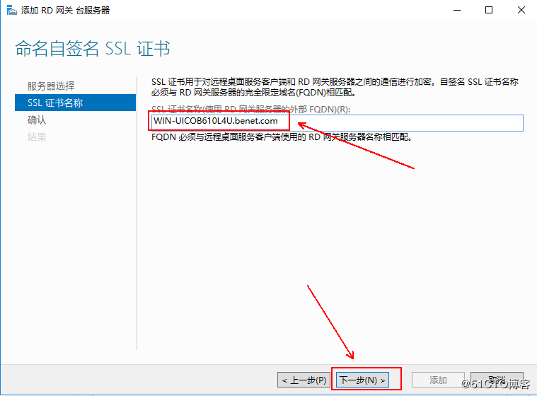 6、這里需要輸入的是RD服務器(也就是這個服務器本身)的完全名稱,然后單擊“下一步,”如下所示: