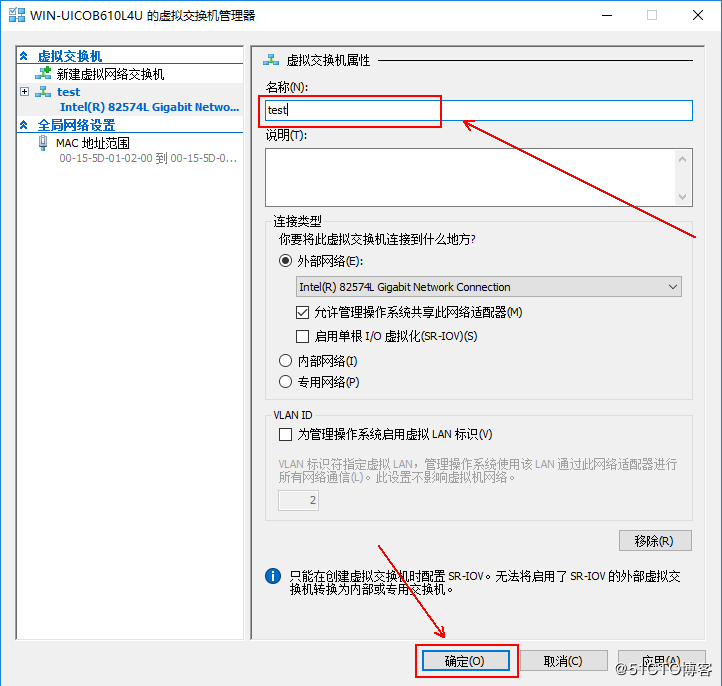 4、設置虛擬交換機的名稱,然后單擊“確定”: