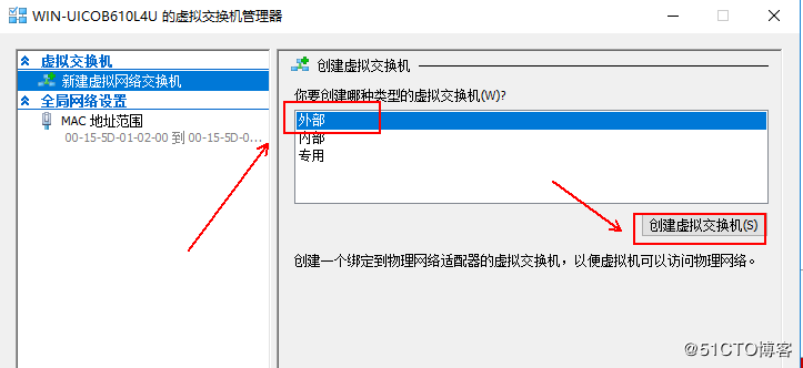 3、選擇“外部”,然后單擊“創(chuàng)建虛擬交換機”: