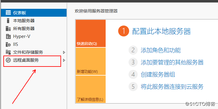 1、在RD服務器上,使用域管理員登錄,然后,打開服務器控制臺,單擊“添加角色和功能”: