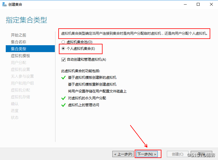 4、在“指定集合類型”如果采用每個用戶專有虛擬桌面,可選中“個人虛擬機集合”,然后單擊下一步,反之,可選擇“虛擬機集合池”,這里可根據(jù)實際需求來定義: