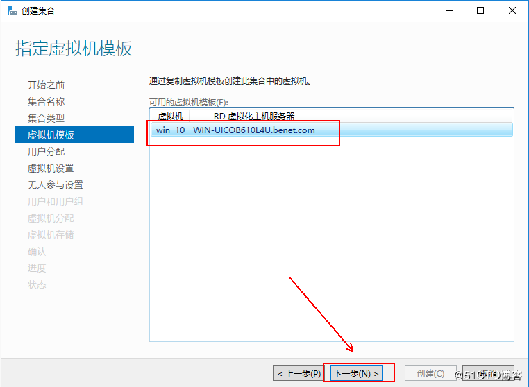 5、在這里指定虛擬機模板,由于這里只做了一個模板,也就是剛剛創(chuàng)建的虛擬機,所以這里只有這一個,可根據(jù)實際情況,來選擇相應的模板,并單擊“下一步”: