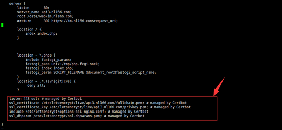 如上圖所示,如果你配置了監(jiān)聽443端口的server,他會(huì)幫你自動(dòng)找到對(duì)應(yīng)域名的配置文件,并添加下面兩行,還把我格式打亂了,}號(hào)與上面{的縮進(jìn)不對(duì)應(yīng)了,不過(guò)不影響功能,這里不知道會(huì)不會(huì)根據(jù)nginx的版本選擇是否添加ssl on;