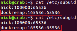 請注意 subuid 的設置信息,我們?yōu)?dockeruser 設置的從屬 ID 和 nick 用戶是不重疊的,實際上任何用戶的從屬 ID 設置都是不能重疊的。