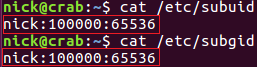 用戶 nick,在當前的 user namespace 中具有 65536 個從屬用戶,用戶 ID 為 100000-165535,在一個子 user namespace 中,這些從屬用戶被映射成 ID 為 0-65535 的用戶。subgid 的含義和 subuid 相同。