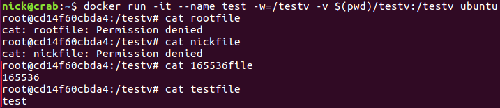 $ docker run -it --name test -w=/testv -v $(pwd)/testv:/testv ubuntu