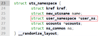 以 uts namespace 為例,在 uts_namespace 的結構體中有一個指向 user namespace 的指針,指向它所屬的 user namespace(筆者查看的 v4.13內(nèi)核,uts_namespace 結構體的定義在 /include/linux/utsname.h 文件中):