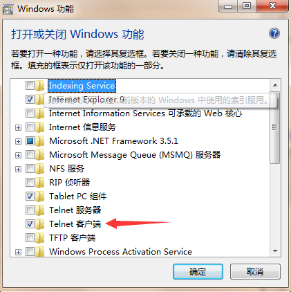 將telnet客戶端勾選確認(rèn)即可,在dos窗口輸入命令: