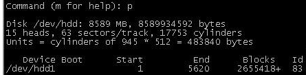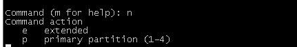 其中e屬于擴展分區(qū),p表示主分區(qū)。選擇主分區(qū),輸入1表示第一個主分區(qū)