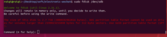 使用sudo fdisk /dev/sdb 進行分區(qū)。輸入m進行幫助展示。告知我們進行怎么的操作。
