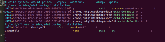3、修改/etc/fstab 文件:zai文件系統(tǒng)下面增加 uuid= “” 要掛在的目錄, 磁盤文件類型。 默認操作 0 2