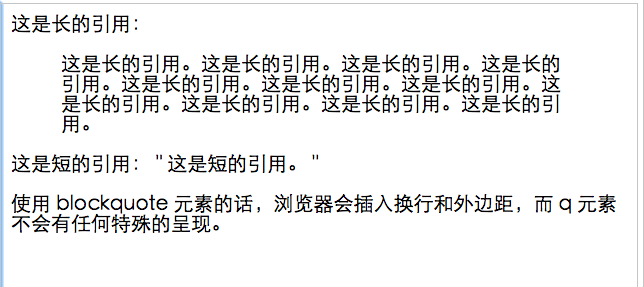 - 使用 blockquote 元素的話,瀏覽器會(huì)插入換行和外邊距,而 q 元素不會(huì)有任何特殊的呈現(xiàn)。
