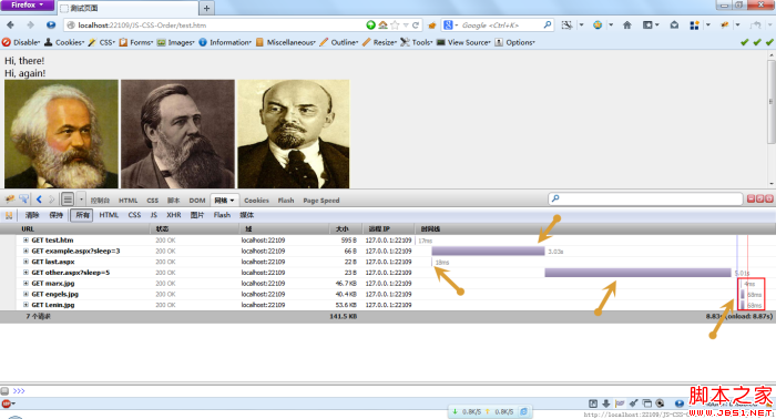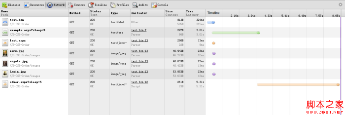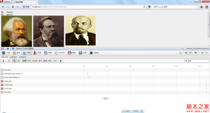 經(jīng)過在Opera中測試,發(fā)現(xiàn)Opera瀏覽器比較“守規(guī)矩”,所有的資源都是按順序加載的,并沒有出現(xiàn)所謂的預先加載,下面是一張總的效果圖: