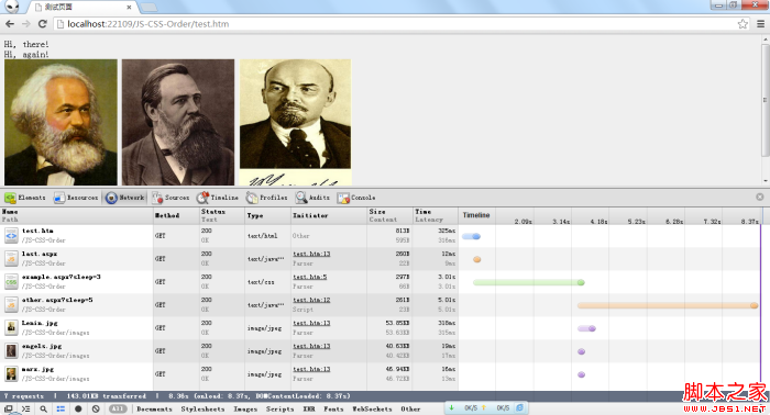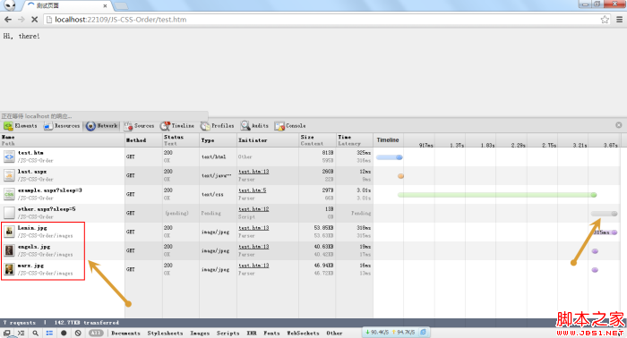 通過網(wǎng)絡(luò)請求可以看出,example.css已經(jīng)加載完成,other.js處于pending狀態(tài),但此時script標簽底下的三張圖片已經(jīng)下載下來了,這是由瀏覽器的預先加載的功能所致。但是由于瀏覽器的渲染被other.js腳本阻塞住,所以,這三張圖片連同它上面的“Hi again”都不會顯示出來。另外,此時last.js中的代碼還沒有執(zhí)行。