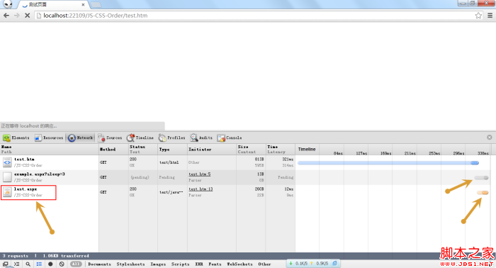 從上圖中可以看出,test.htm 文檔已經(jīng)加載完成,頁面上還沒有顯示任何東西,example.css處于pending狀態(tài),但是,位于最底部的last.js卻加載完成了。這說明chrome進行了預加載,提前下載,放在了瀏覽器的緩存里了。雖然last.js已經(jīng)加載完成,但是還沒有被執(zhí)行,因為他前面的樣式文件會阻塞腳本的執(zhí)行。