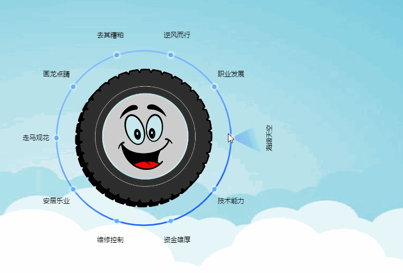 最近筆者有個需求,需求內(nèi)容為:一組文字顯示在圓環(huán)的周圍,用戶可添加文字,文字圍繞著圓環(huán),每個詞對應圓環(huán)周圍的的藍色小圓點,當用戶鼠標放在圓環(huán)上方小藍點時時,實現(xiàn)放射出三角形,再顯示出文字,先看看動圖效果吧!