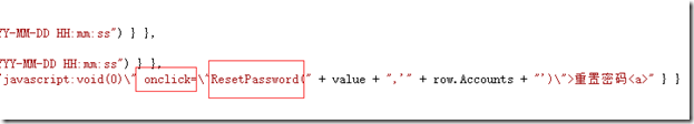 在添加script代碼中表格代碼段可以看到,這里通過 連接的onclick調(diào)用ResetPassword方法,所以ResetPassword方法要放在表格生成前面,不然會(huì)出現(xiàn) 方法未定義的錯(cuò)誤。