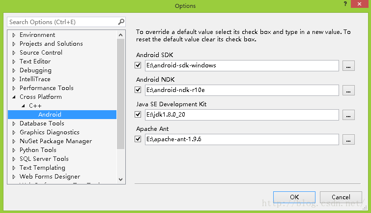 除了Android SDK的手動安裝步驟略繁(必備包括Android SDK Tools, Platform-tools和Build-tools等), 其它基本都是一個zip直接解壓就行了. 最后需要在VS2015->Tools->Options->Cross Platform配置下地址, 具體看圖: