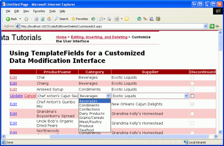 為了使product編輯狀態(tài)下的category和supplier下拉列表選中實(shí)際數(shù)據(jù),并使其可以根據(jù)用戶選擇調(diào)用BLL的UpdateProduct方法對(duì)數(shù)據(jù)庫進(jìn)行更新,我們需要對(duì)兩個(gè)下拉框的SelectedValue分別綁定到CategoryID 和 SupplierID。例如對(duì)于Categories下拉框,我們直接在元素標(biāo)記中增加SelectedValue='%# Bind("CategoryID") %>'。