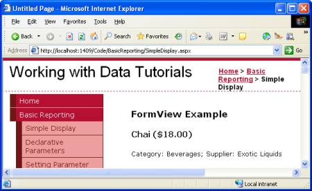 FormView控件提供了這個(gè)層面的用戶(hù)化定制。在使用字段的基礎(chǔ)上(像GridView 和 DetailsView那樣),F(xiàn)ormView控件使用模版,這可以讓我們混合使用Web服務(wù)器控件,靜態(tài)的HTML和綁定語(yǔ)法(databinding syntax)。如果你熟悉ASP.NET 1.x中的Repeater控件,你可以認(rèn)為FormView是只顯示一條記錄的Repeater 。