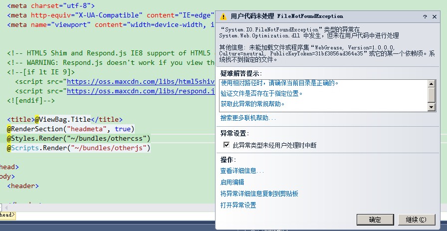 問題:OK,都寫好了運行一下吧,我去,出異常了。第一眼就看見提示“使用相對路徑時,請確保當(dāng)前目錄是正確的”,難道說是BundleConfig.cs定義的文件路徑有問題?