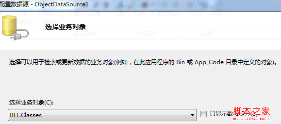 2、點(diǎn)擊控件右上角箭頭“配置數(shù)據(jù)源”彈出對話框選擇業(yè)務(wù)對象 即數(shù)據(jù)源需要調(diào)用到的業(yè)務(wù)層方法 比如班級業(yè)務(wù)對象 BLL.Classes 下一步