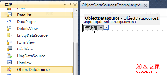 1、從工具箱=》數(shù)據(jù)=》ObjectDataSources拖入ObjectDataSourcesControl.aspx界面中