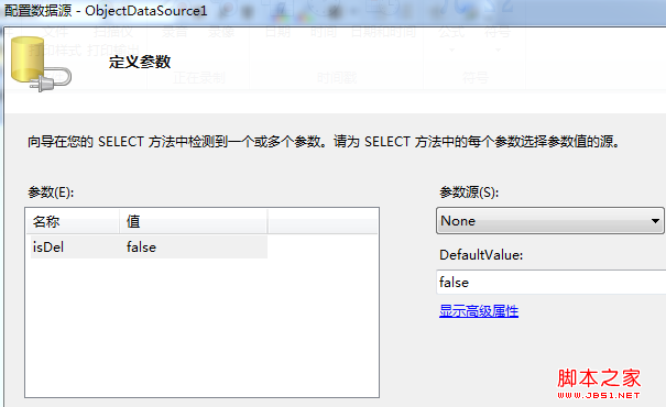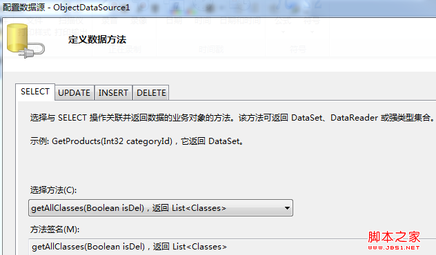 ObjectDataSource用來將一個(gè)類做為數(shù)據(jù)源,TypeName屬性為數(shù)據(jù)源類的全名,有DeleteMethod(刪除方法)、InsertMethod(新增方法)、SelectMethod(查詢方法)、UpdateMethod(修改方法)等幾個(gè)屬性,分別為類中刪除、插入、查詢、更新數(shù)據(jù)的方法名,這些方法可能有參數(shù),參數(shù)的值是通過DeleteParameters、UpdateParameters、InsertParameters等嵌套節(jié)點(diǎn)設(shè)置的。